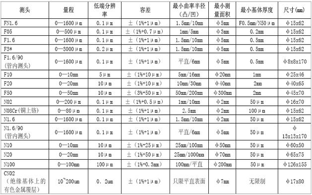 Mintest 1100-4100系列涂層測厚儀可選用測頭的技術數(shù)據(jù)