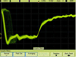 圖9是在模擬示波器上顯示的同樣信號。我們在這里不能示出抖動沿因為它產(chǎn)生在觸發(fā)參考點(上升沿)之前。但能觀察到信號沿有時產(chǎn)生間歇毛刺。我們不能用模擬示波器觀察毛刺因為對常規(guī)模擬示波器顯示而言它出現(xiàn)次數(shù)太少即使把顯示亮度調(diào)到最亮。