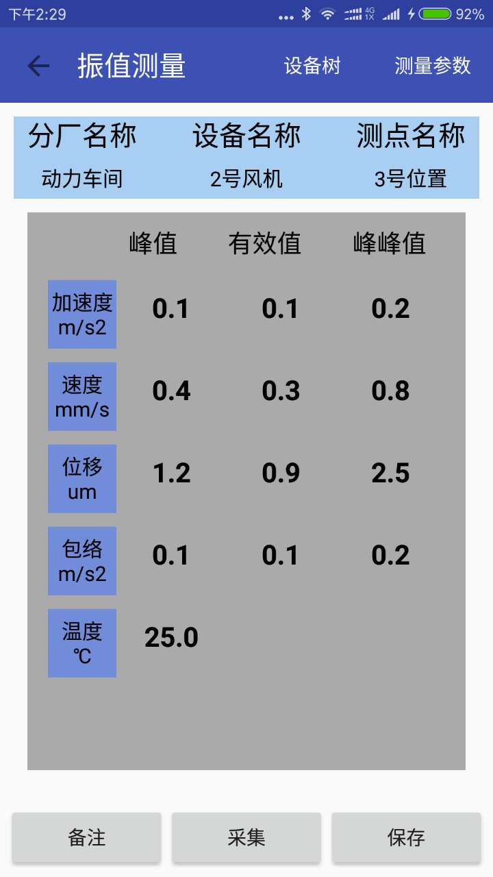 ↑多數(shù)據(jù)同時顯示:加速度、速度、位移、包絡、溫度